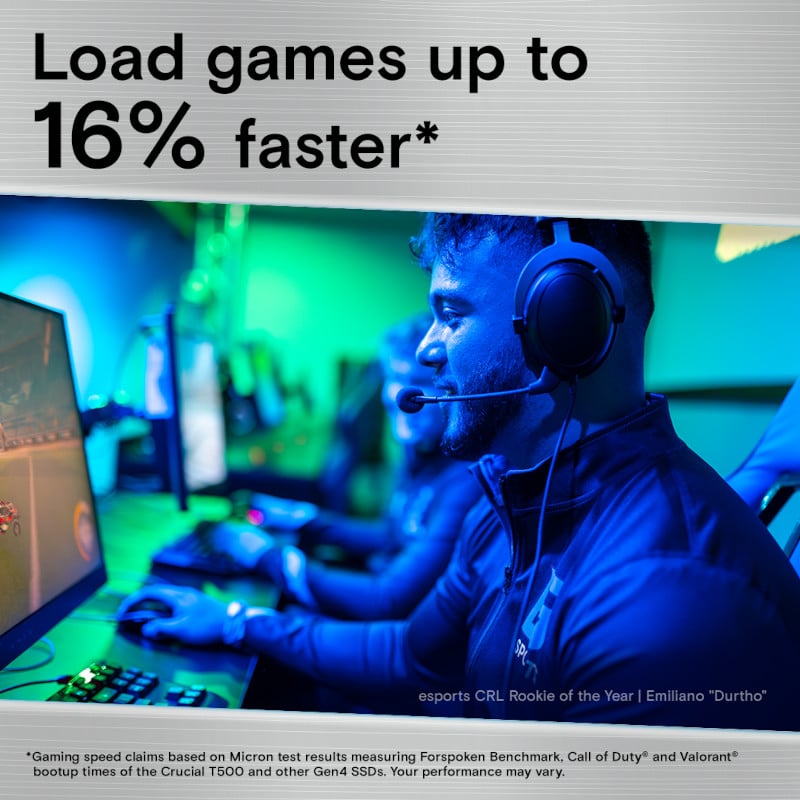The Crucial T500 PCIe® Gen4 NVMe SSD will improve your gaming and content creation experience. The T500 is a game changer, designed for high-performance gaming, PS5 upgrades, and photo/video editing. With sequential read/write speeds of up to 7,200/5,700MB/s and random read/write speeds of up to 1.39M IOPs, you’ll be able to load games 16% faster and enjoy a 42% increase in content creation app performance.