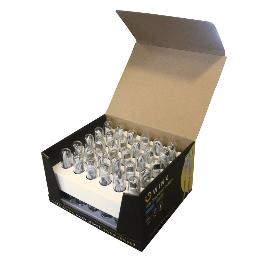 The WINX USB Charging Cables Set are the ideal solution to charge your mobile devices. Ideal for Apple devices, whether you need a USB to Lightning cable or a USB to Type-C cable, we have you covered. These durable cables come in a 1m length with a nylon braided design and support 2.4A Fast Charging. This set includes 15 x USB to Lightning cables and 15 x USB to Type-C cables and can be stored in the included charging cable display box.
